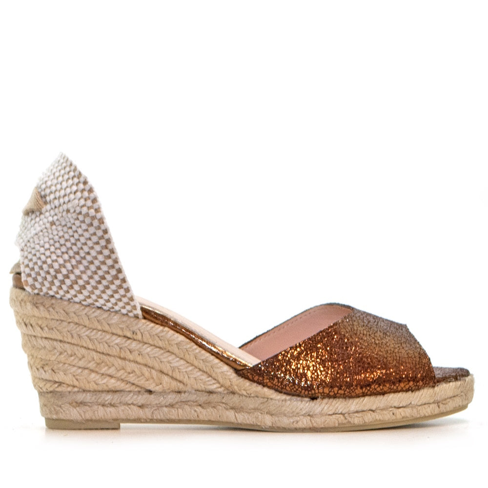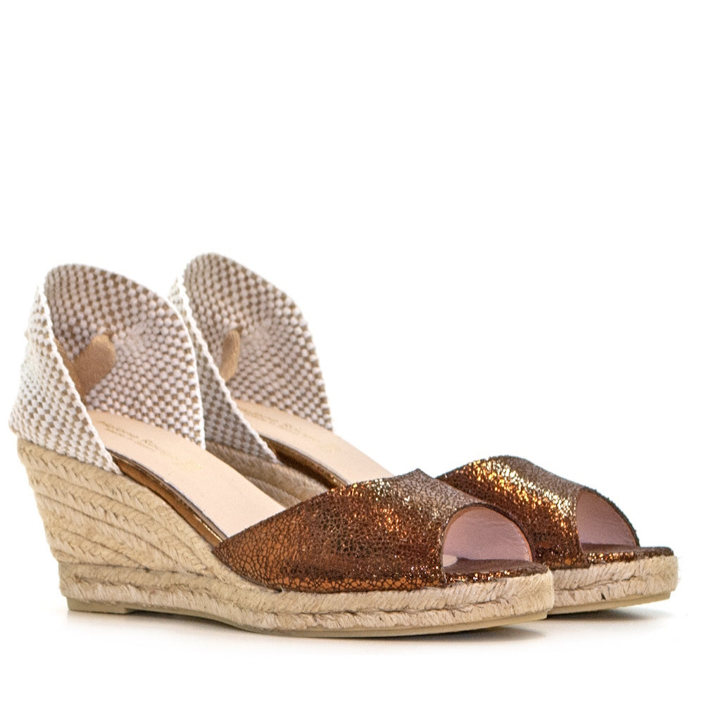 La sandalia Ana Belén en piel serraje boreal bronce captura la esencia del brillo contenido y elegante. Su acabado metálico, sutilmente luminoso, aporta un aire sofisticado sin perder la naturalidad del serraje. Hecha en España con técnicas artesanales, su tacón de alpargata de 65 mm permite estilizar con comodidad durante todo el día. Este diseño fusiona tradición mediterránea y modernidad, ideal para quienes buscan destacar con discreción. El tono bronce se convierte en un básico de verano con carisma propio, elevando cualquier look con un gesto de luz.